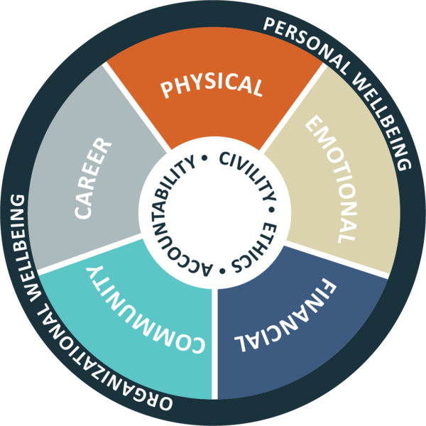 “Wellbeing at Work” designation levels are based on each worksite’s level of engagement in the program. Program options fall into one of 5 categories of the Wellbeing Wheel: Career, Financial, Physical, Social, Emotional. This approach aligns with the Total Wellbeing Philosophy embraced by the Employee Health Benefits Department. Resources related to each of these areas can be found in the left-side navigation.
