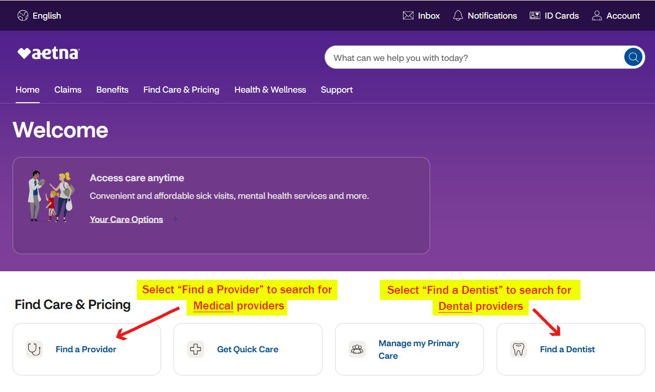 For Medical Insurance and/or Dental Insurance: To search for in-network physicians and other medical providers in the Aetna network, you can log into your Aetna portal or search their directory as a Guest User. Please see the instructions below.